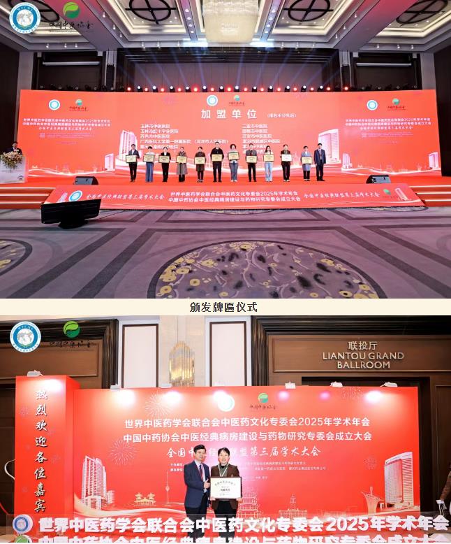 2025 年11月20-23日,世界中醫(yī)藥學(xué)會(huì)聯(lián)合會(huì)中醫(yī)藥文化專委會(huì)2025年學(xué)術(shù)年會(huì)、中國(guó)中藥協(xié)會(huì)中醫(yī)經(jīng)典病房建設(shè)與藥物研究專會(huì)成立大會(huì)暨全國(guó)中醫(yī)經(jīng)典聯(lián)盟第三屆學(xué)術(shù)大會(huì)在武漢隆重舉辦。