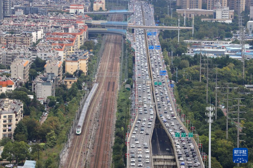 10月7日,車輛行駛在江蘇省南京市應(yīng)天高架上(無人機照片)。